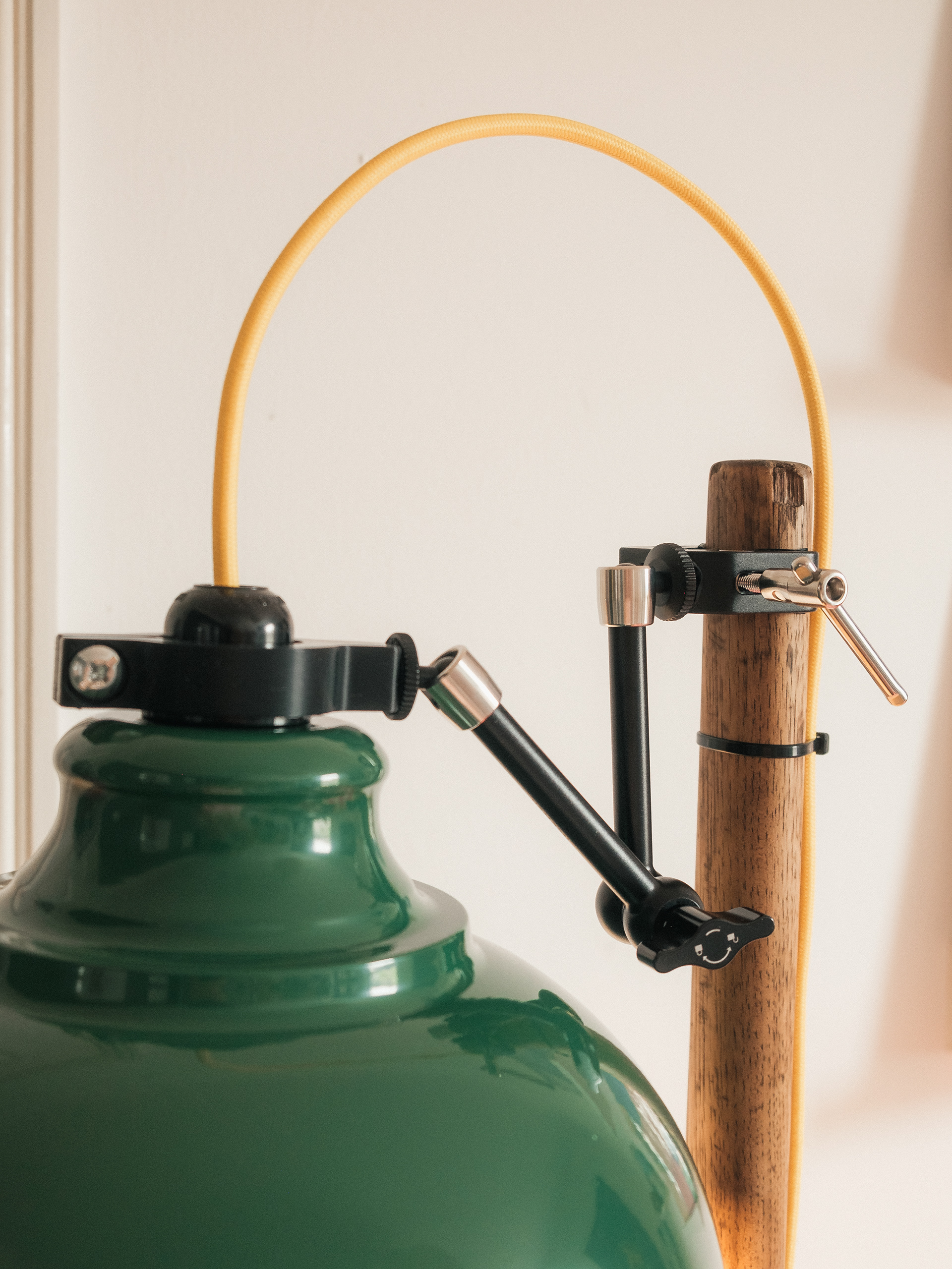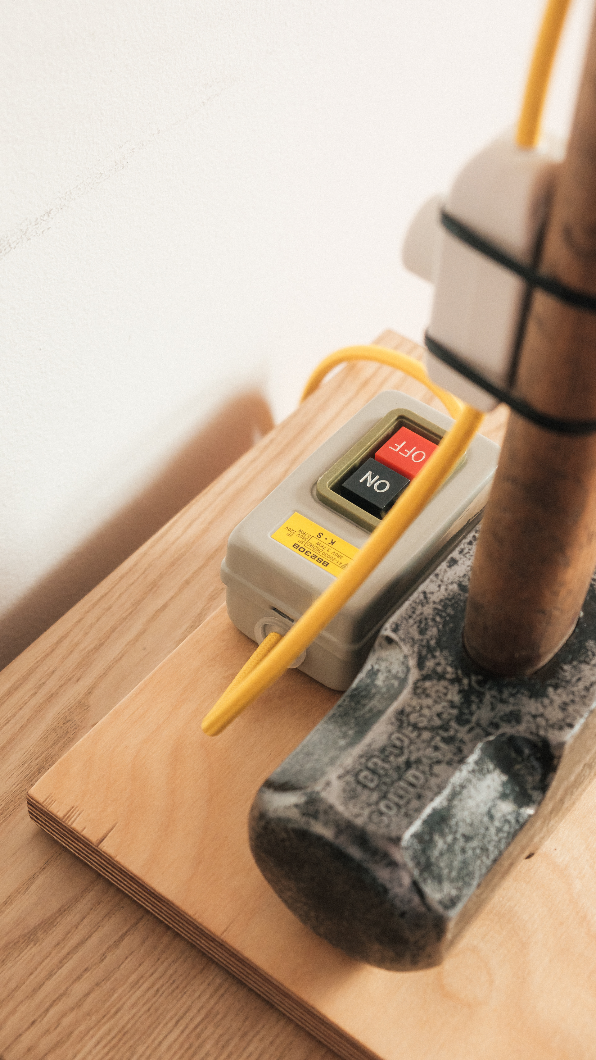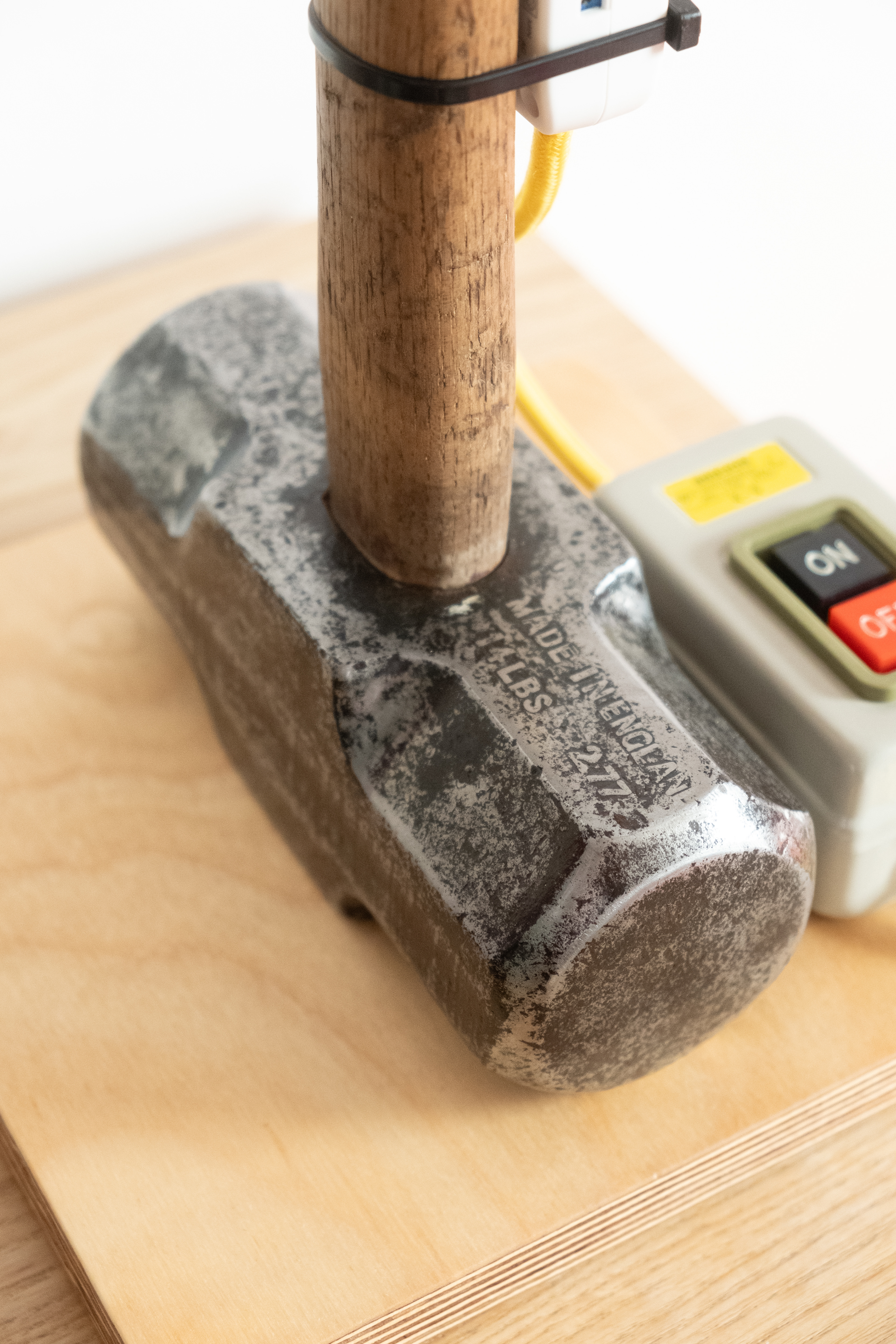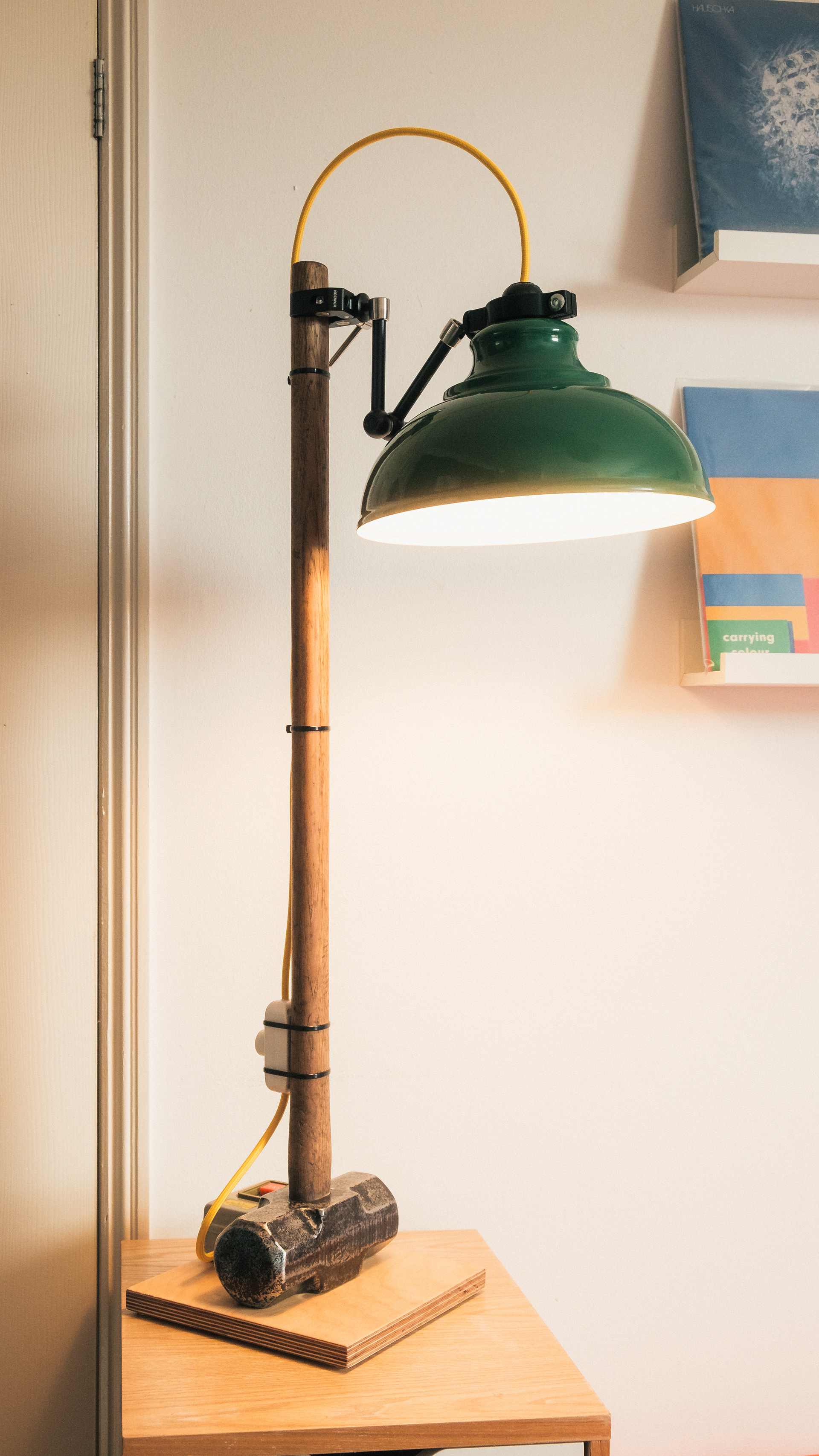 Restored vintage British sledgehammer, birch ply base, custom lamp mount, articulating arm, dimmer, industrial fittings & braided cable.