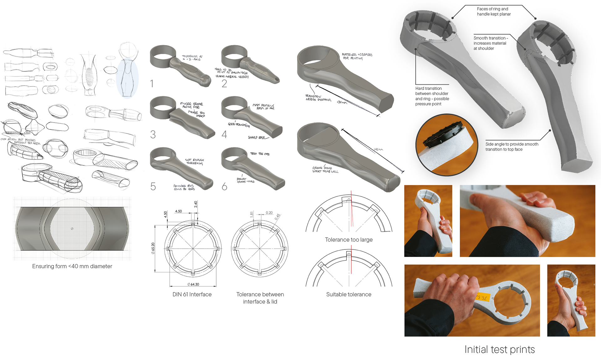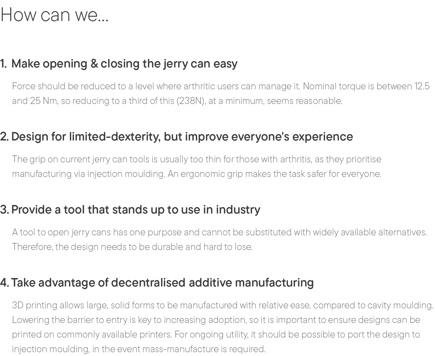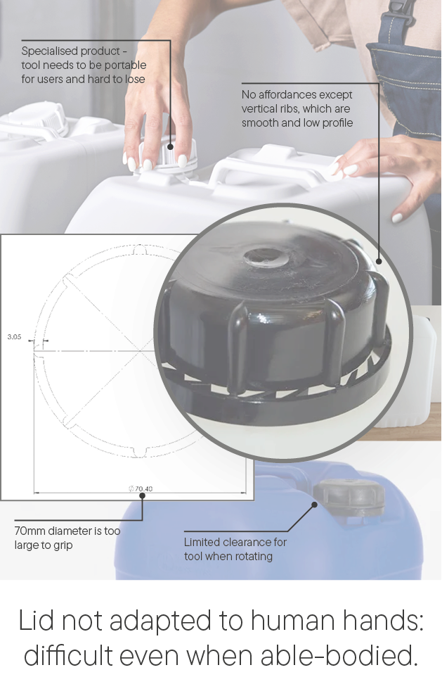 Design a product that aids in opening and closing a plastic jerry can. Key drivers are improving users' grip on the lid, their ability to apply torque, and making the whole action 'easy'.
