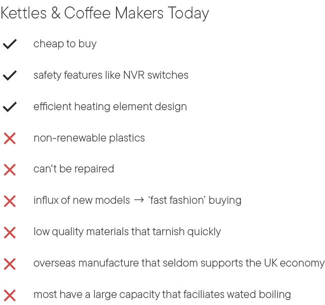 The kettle and coffee maker must be suitable for distributed craft manufacture in the UK and repairable by the end-user.